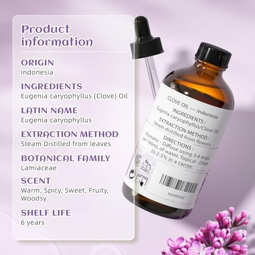 Variety Uses & Applications – Simply add a few drops clove essential oil to your diffuser or humidifier to cleanse and refresh air. For other uses other than aromatherapy we recommend always diluting with a carrier oil.